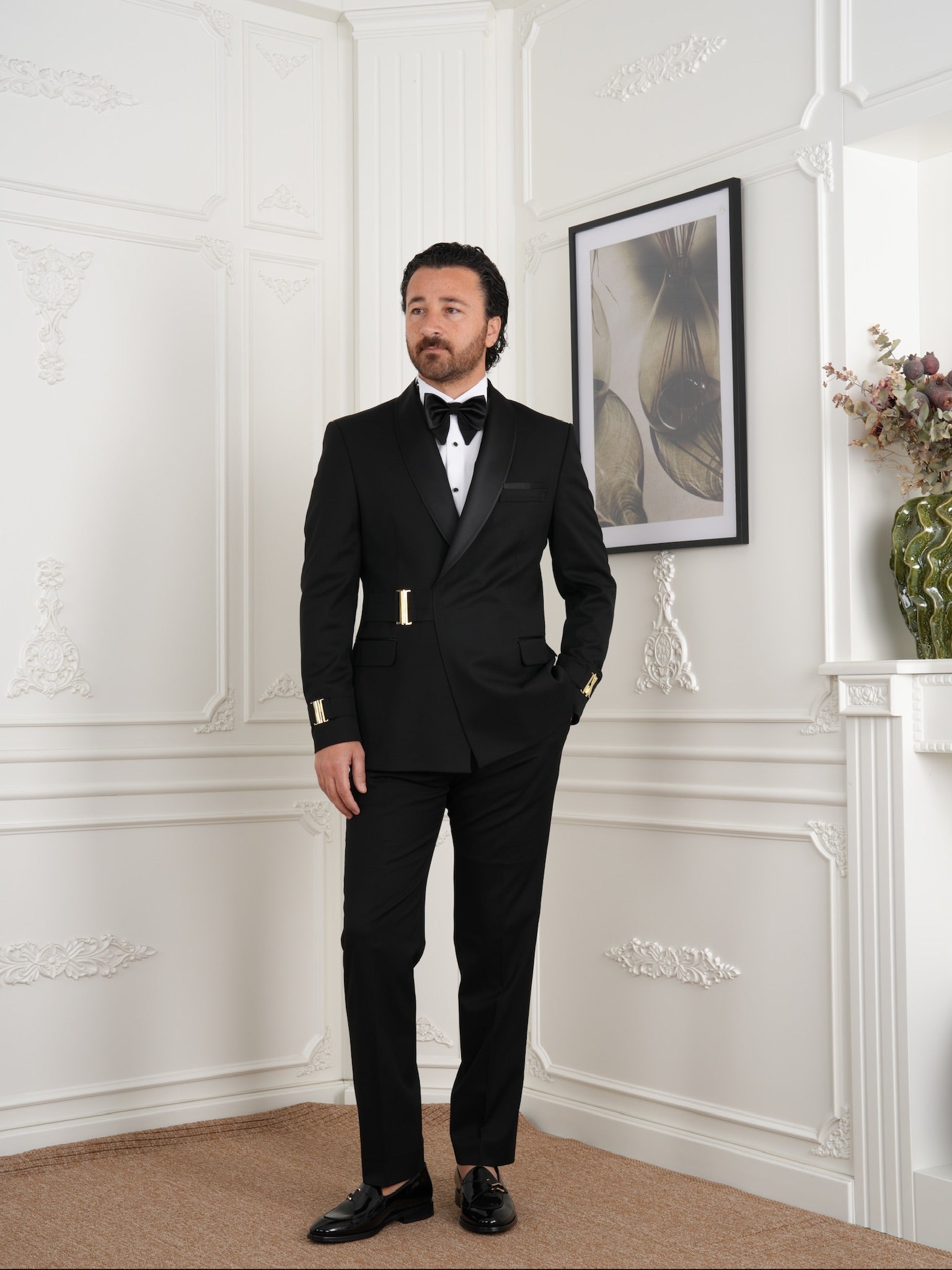 Bold, modern, and refined — The Axis is a tuxedo that speaks confidence. Featuring a sleek satin shawl collar and signature gold metal buckles at the waist and cuffs, this slim-fit design delivers a standout look for formal events and special occasions.