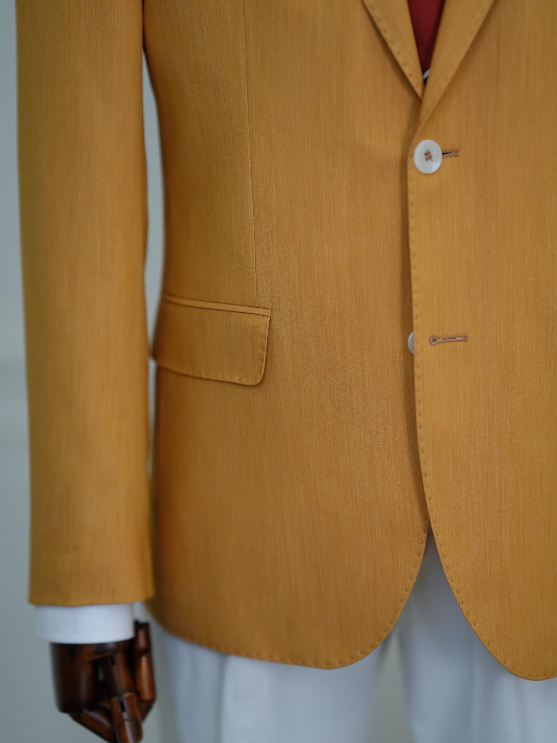 The Marigold channels bold elegance with its radiant ochre tone and crisp single button silhouette. Designed for standout summer occasions or refined daytime looks.