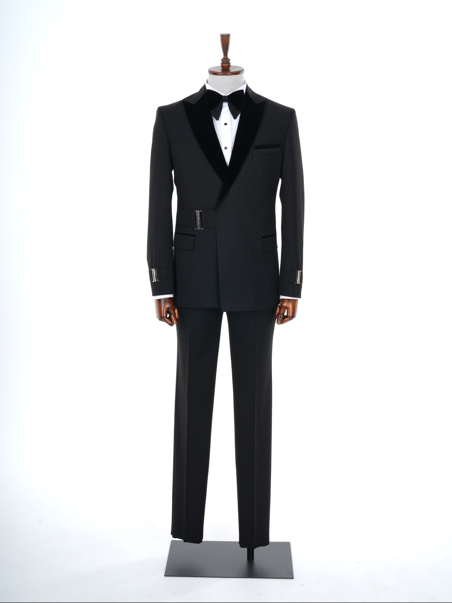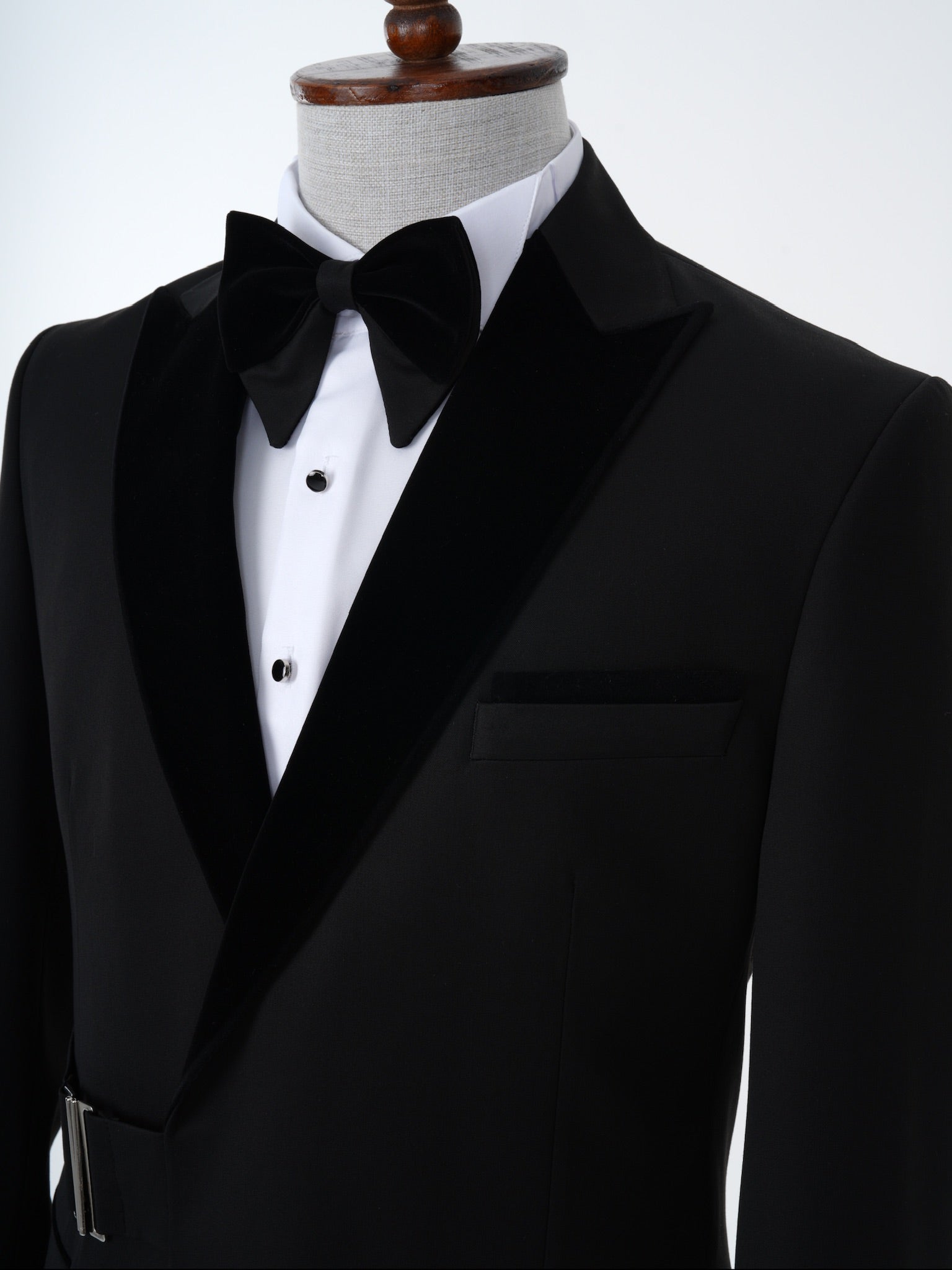 The Obsidian is crafted for those who prefer subtle power and modern precision. With its deep black color, rich velvet shawl collar, and sleek silver buckle detailing at the waist and cuffs, this tuxedo delivers refined elegance with an edge.