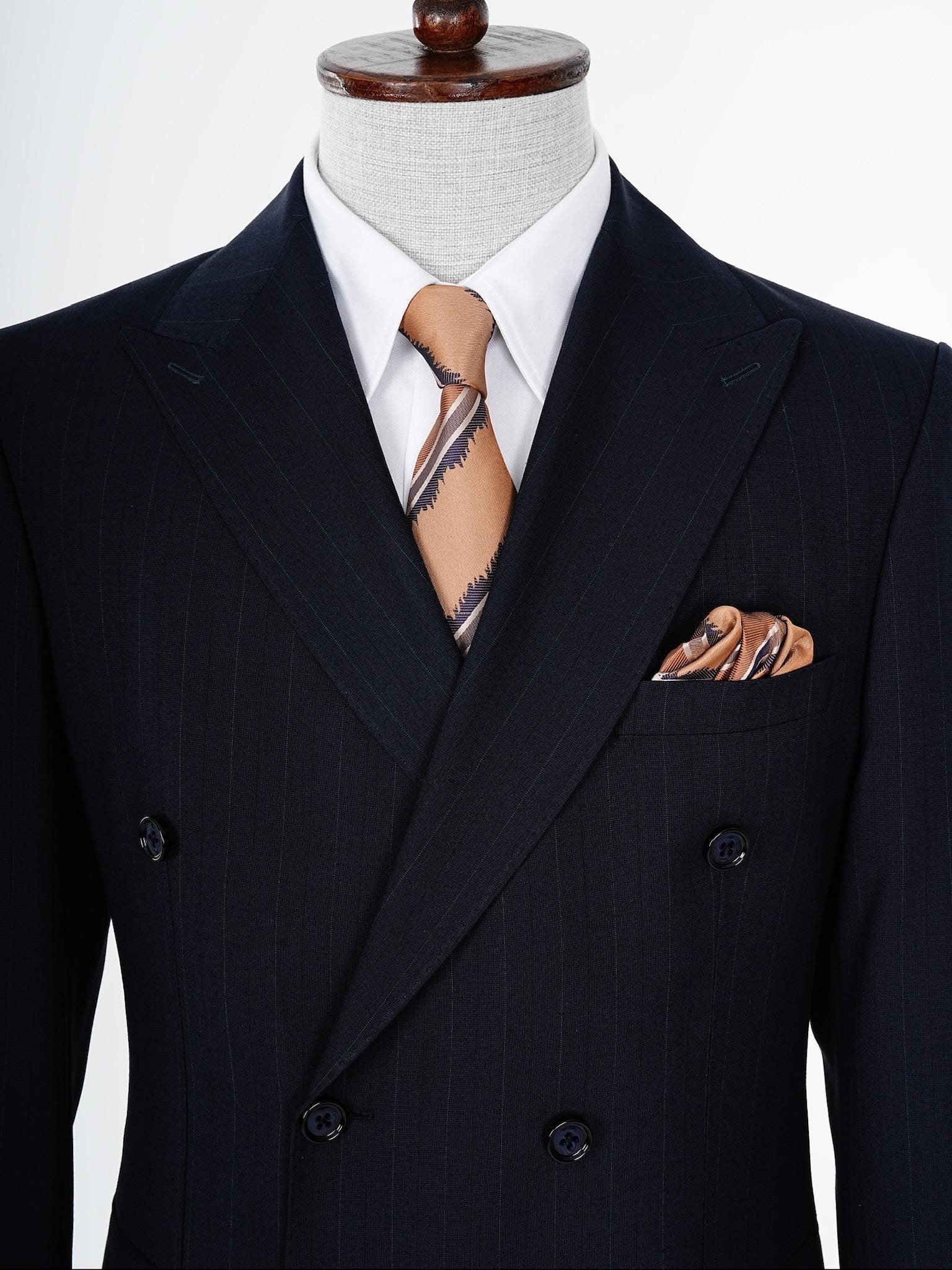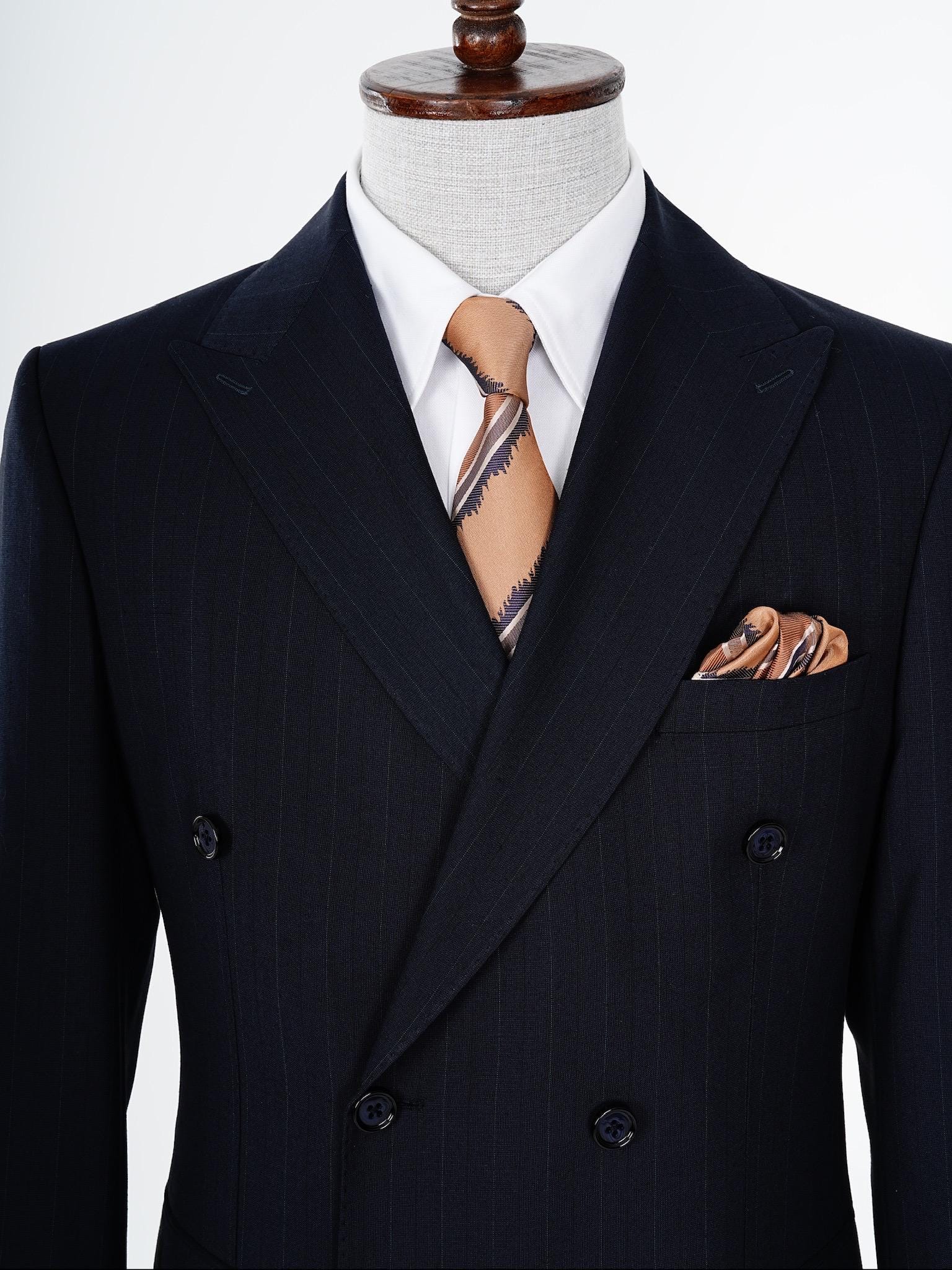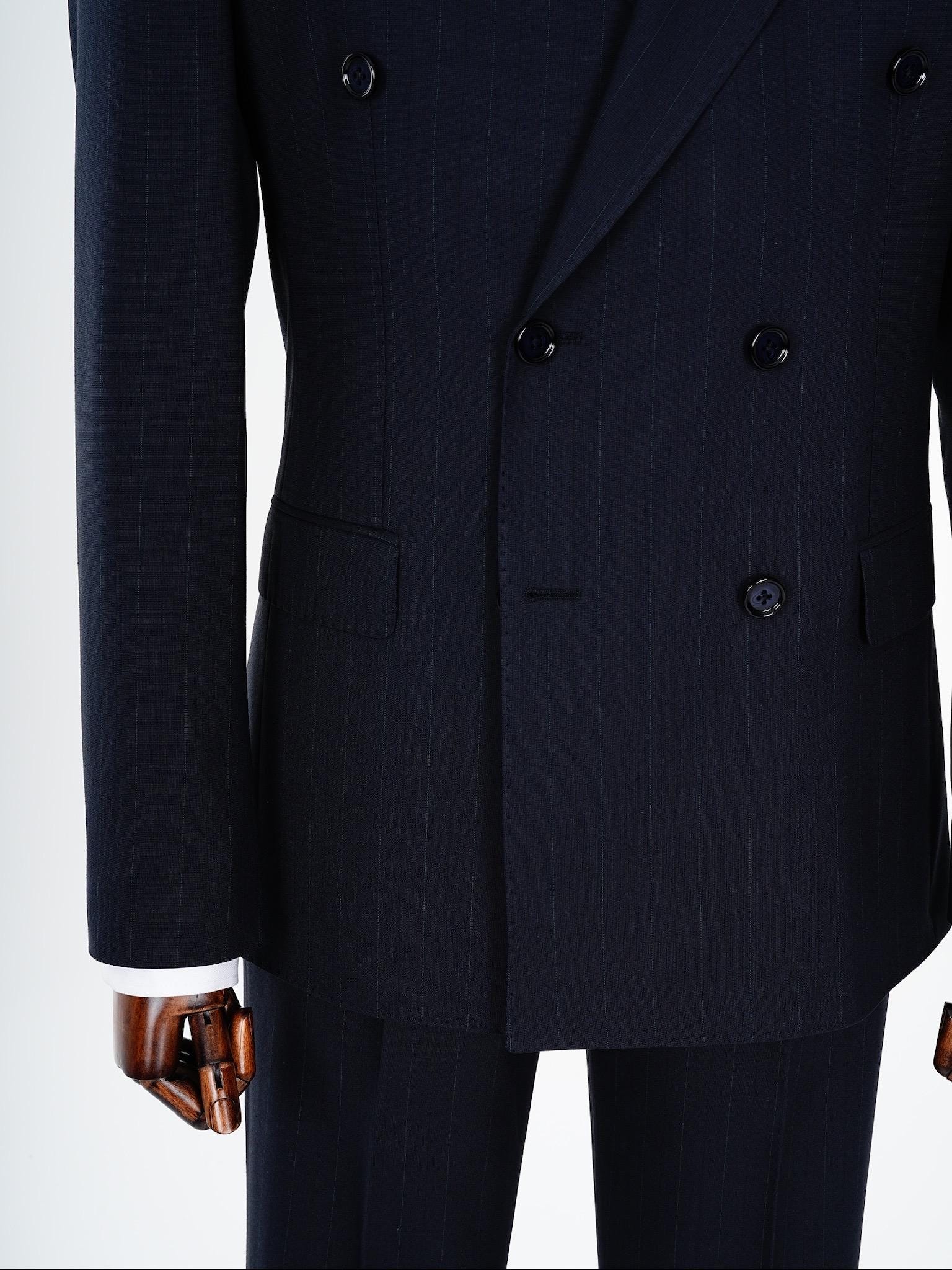 The Valencia is a classic with a modern edge, featuring a bold double breasted design, strong peak lapels, and sleek pinstripe detailing. The deep navy tone offers a timeless foundation, elevated by fine tailoring and confident structure.