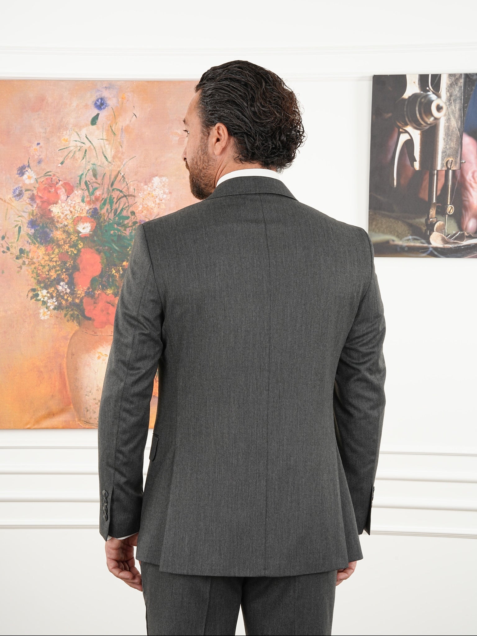 Step up your style with this Gray solid single breasted Closure suit, crafted for elegance and sophistication. Designed with a sharp peak lapel, structured fit, and adjustable waist tabs, this suit offers a perfect balance of vintage charm and modern tailoring.