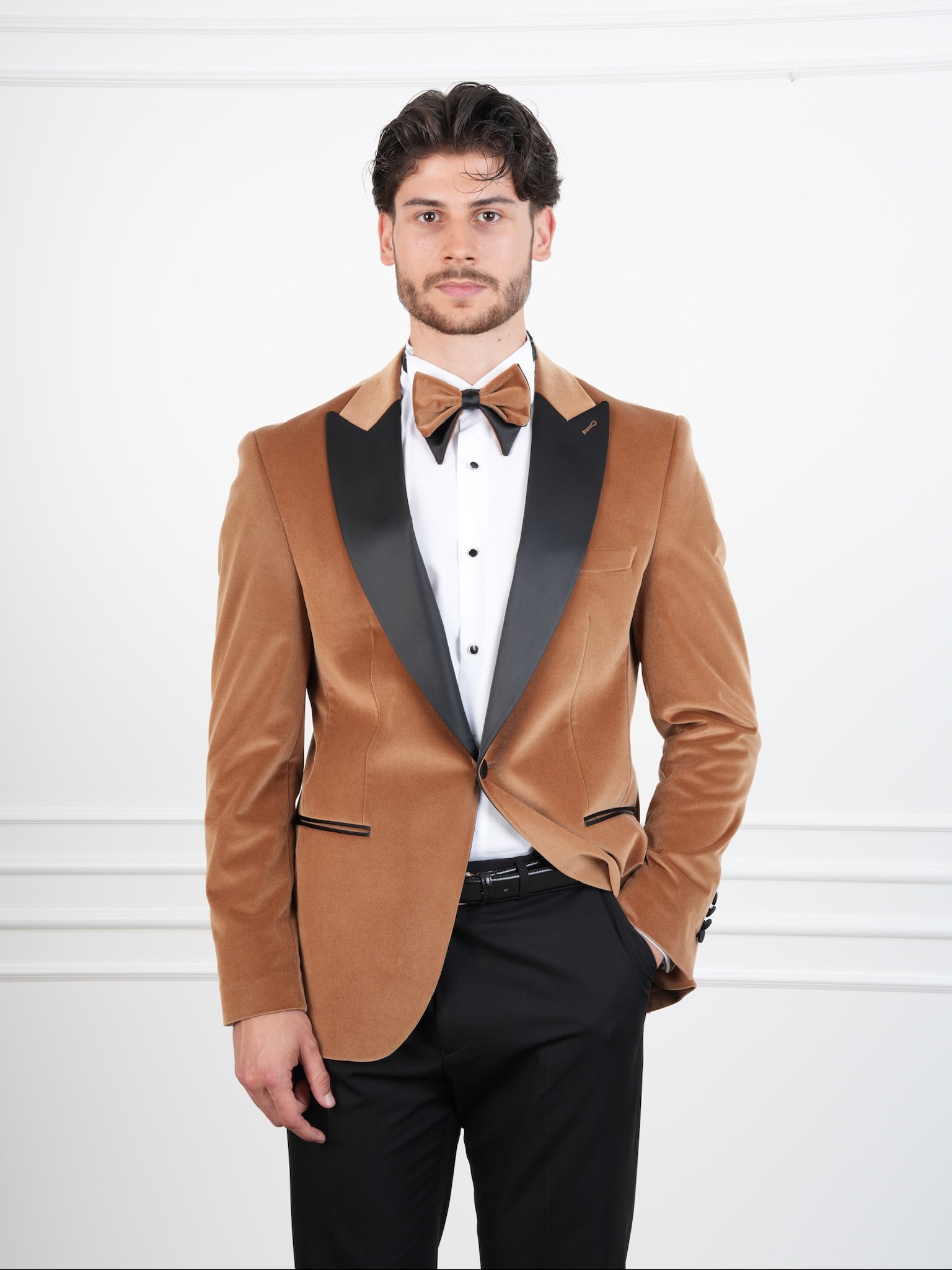 The Regent – Golden Brown Velvet Tuxedo with Black Satin Peak Lapel & Matching Bow Tie
