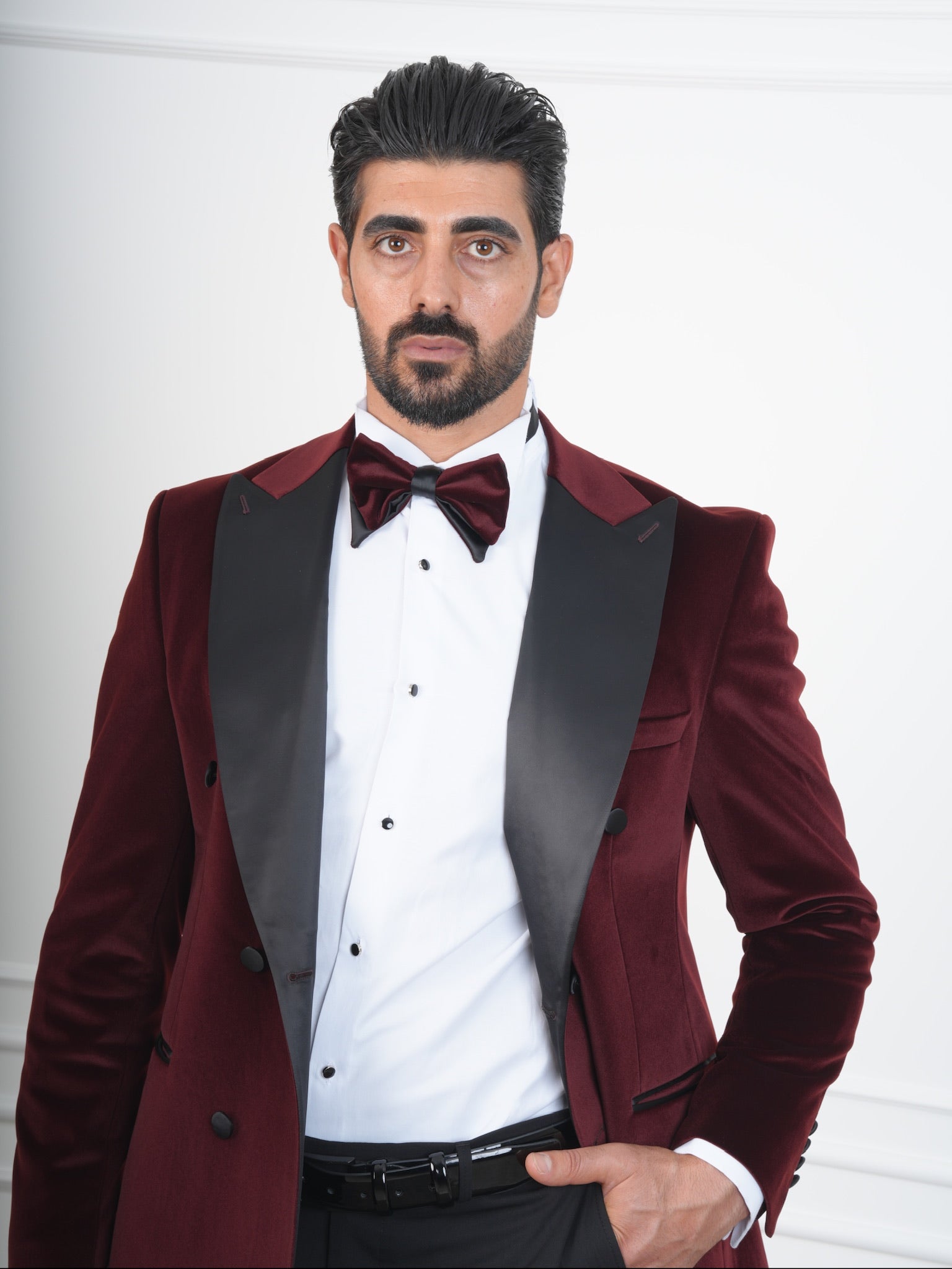 The Castellano – Double-Breasted Burgundy Velvet Tuxedo with Satin Peak Lapel and Bow Tie