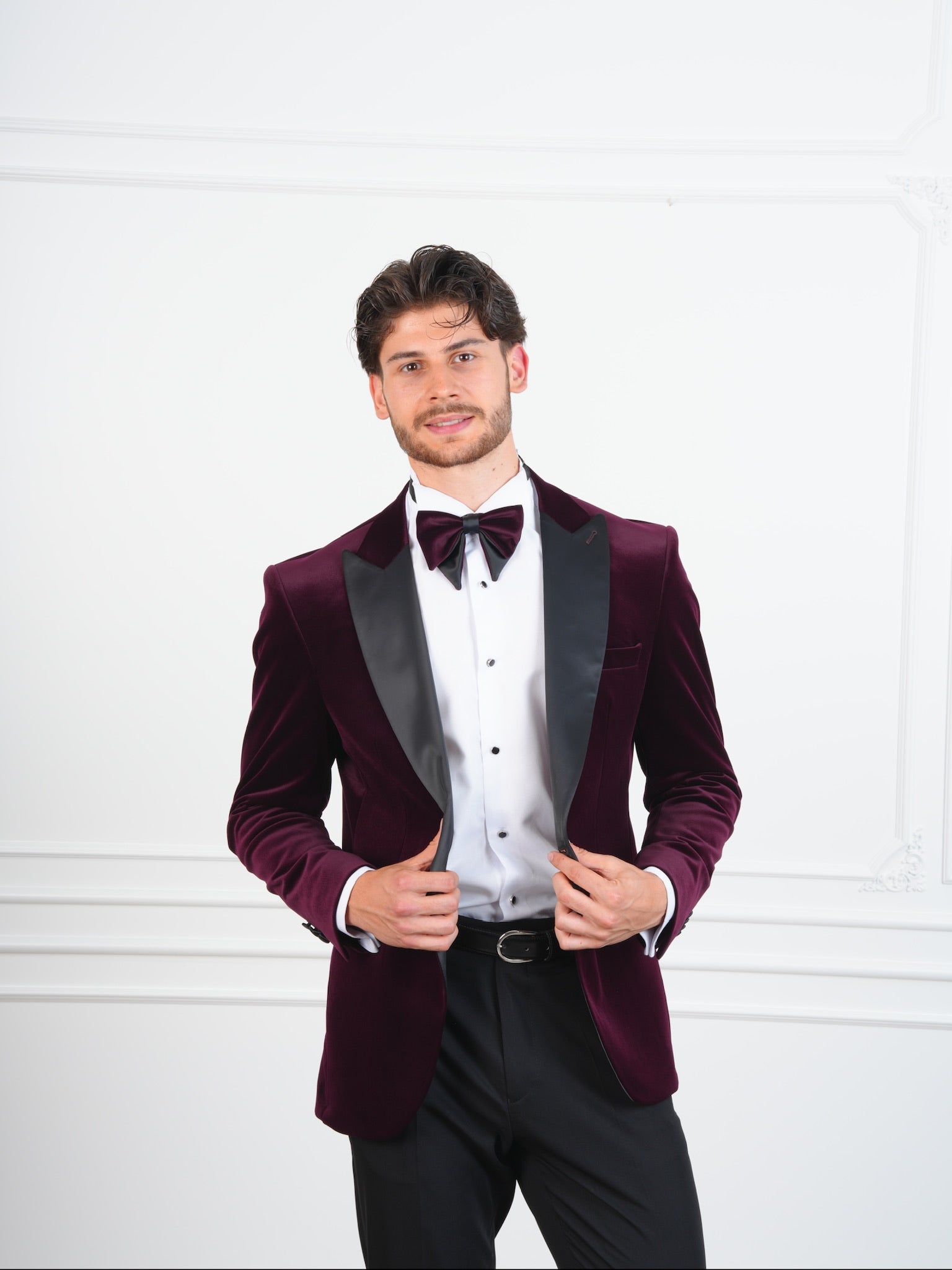 The Ember Noir – Wine Velvet Tuxedo with Black Satin Lapel & Bow Tie, Party Suit for Men