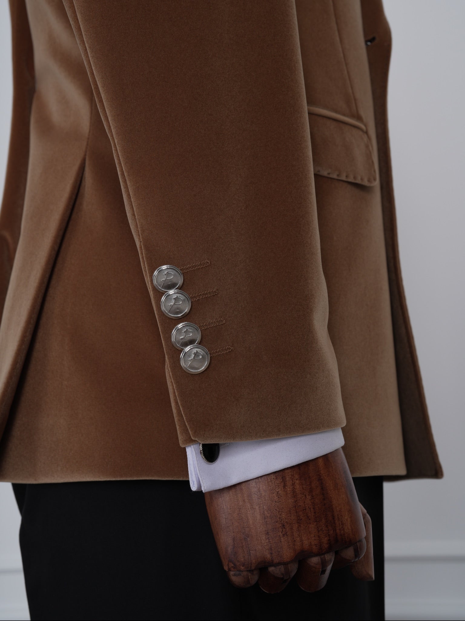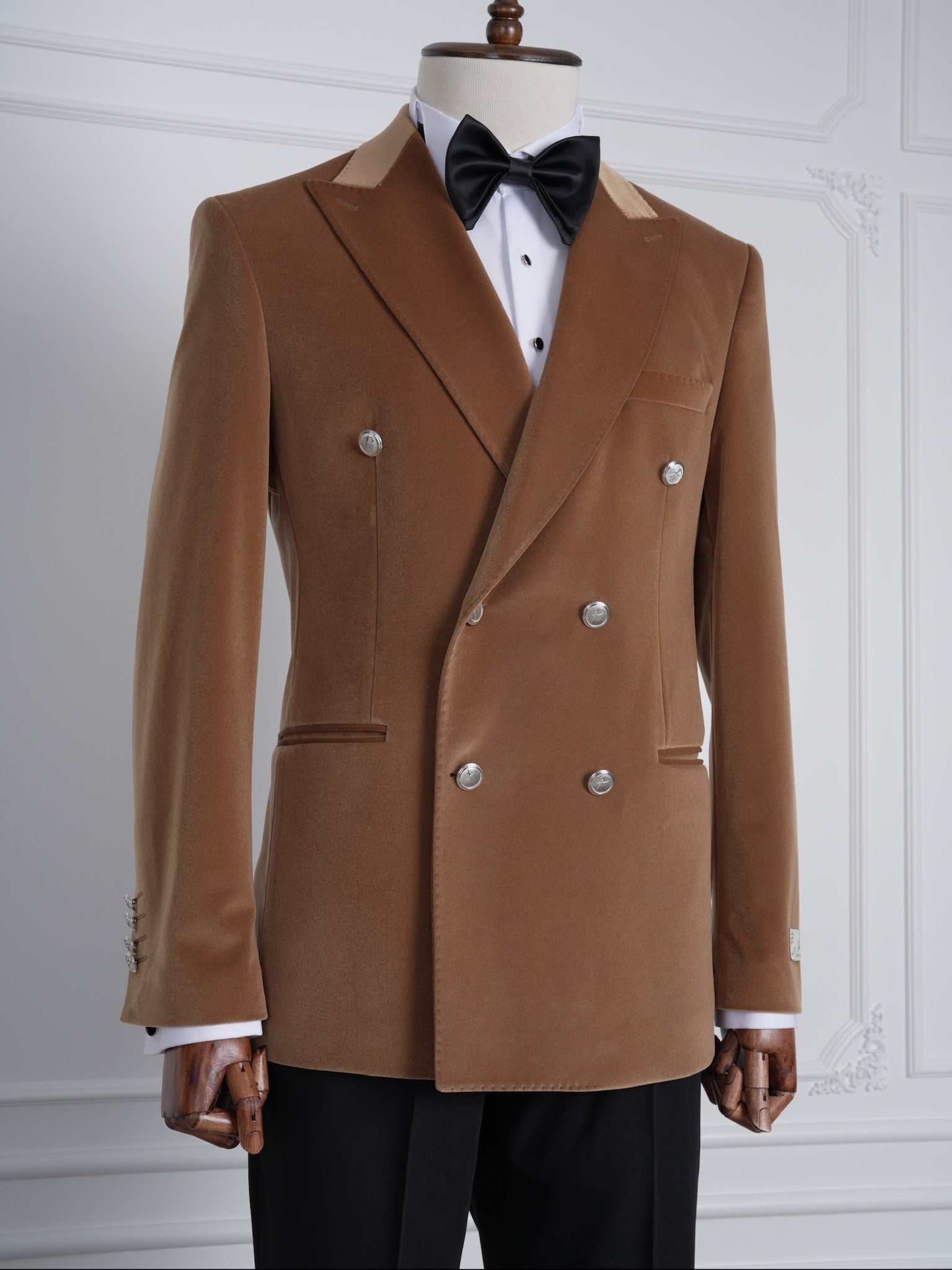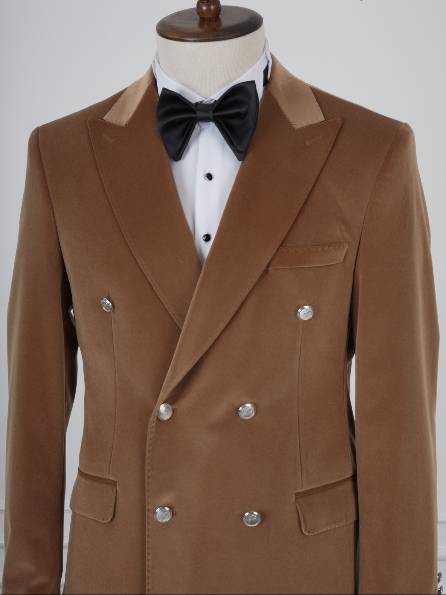 The Monarch – a camel brown velvet tuxedo tailored for men who lead with presence.