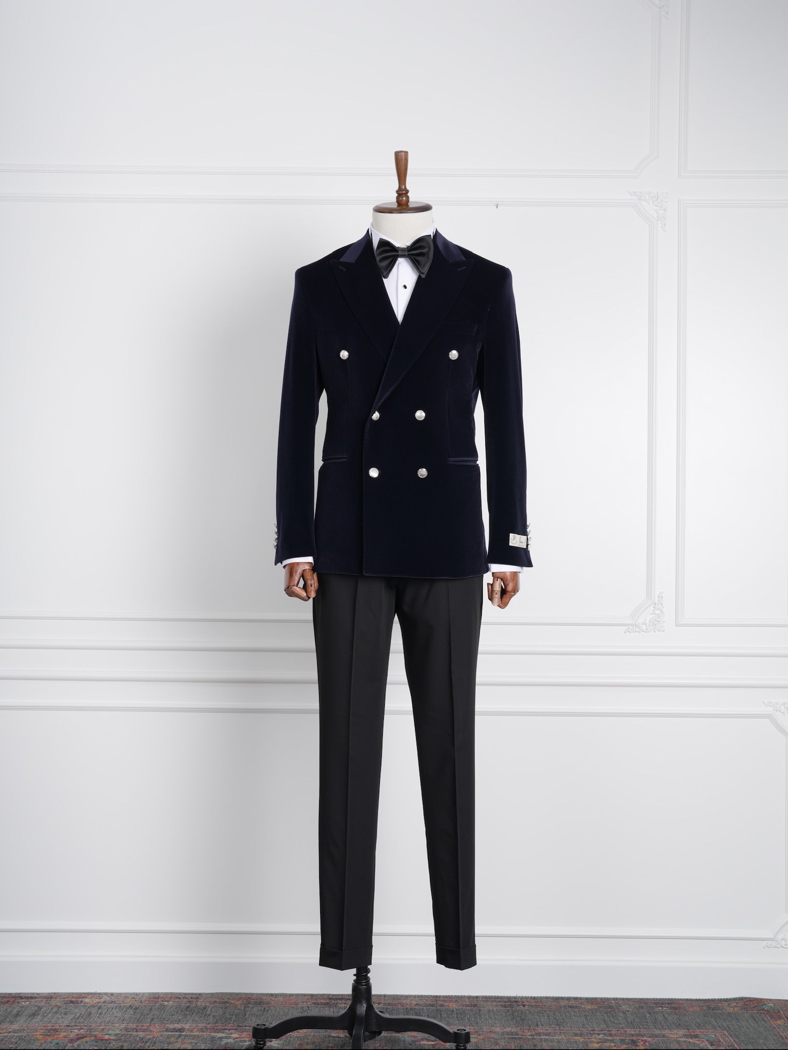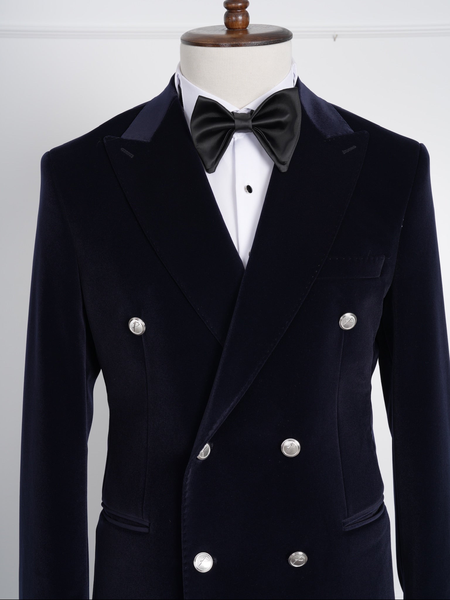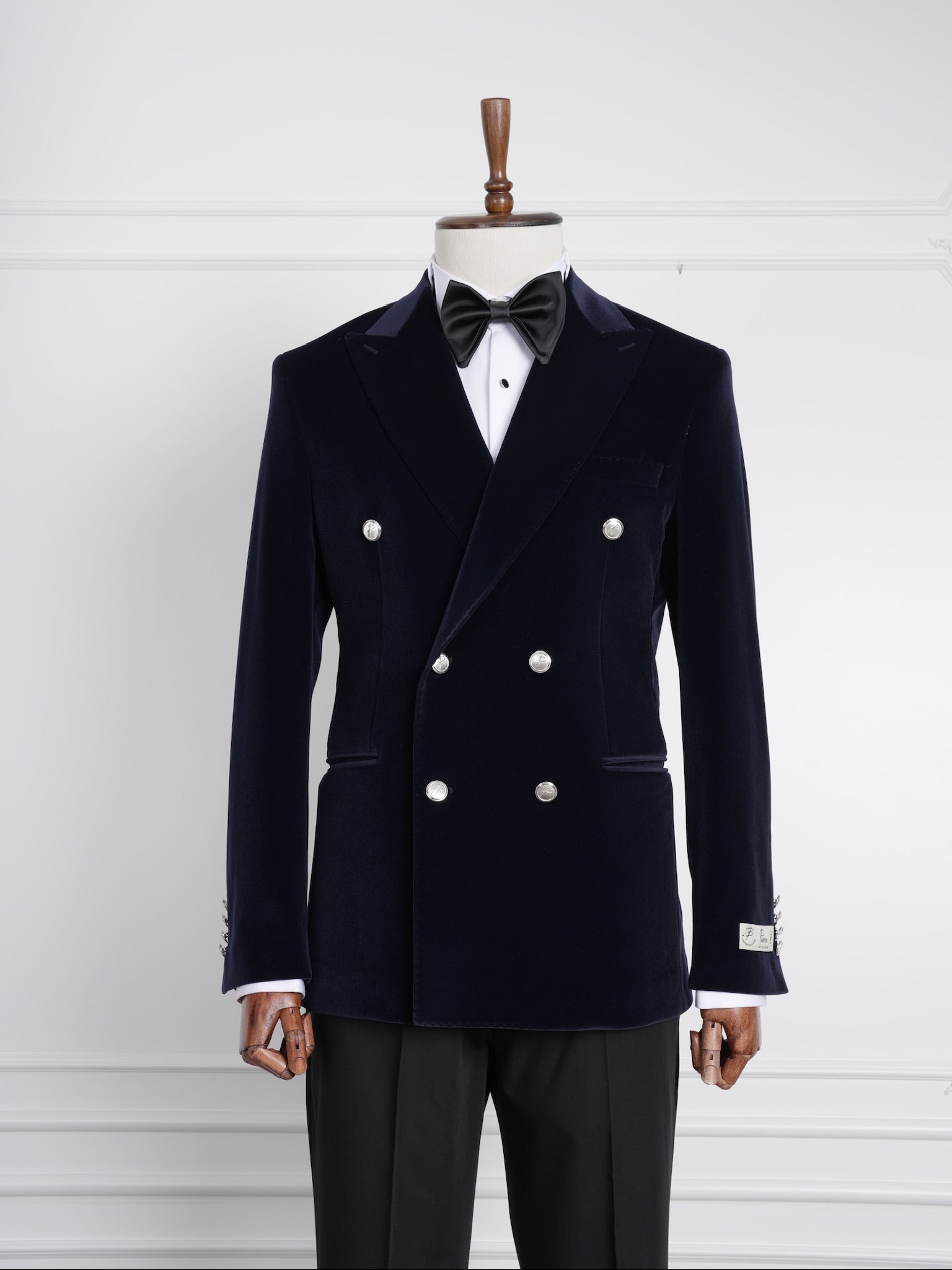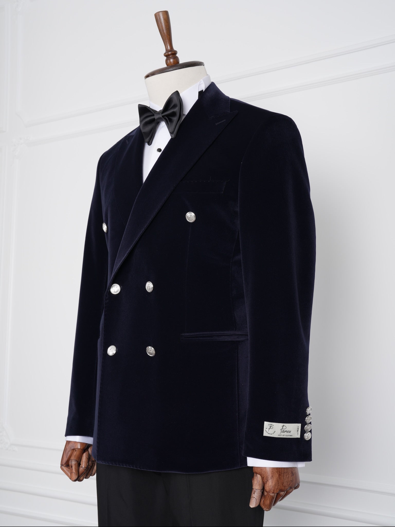 Crafted from rich Navy velvet with a refined satin peak lapel, this double-breasted jacket is designed to deliver timeless elegance and structured charm. Featuring our exclusive Parez signature silver buttons, it offers a confident silhouette for those who command presence.