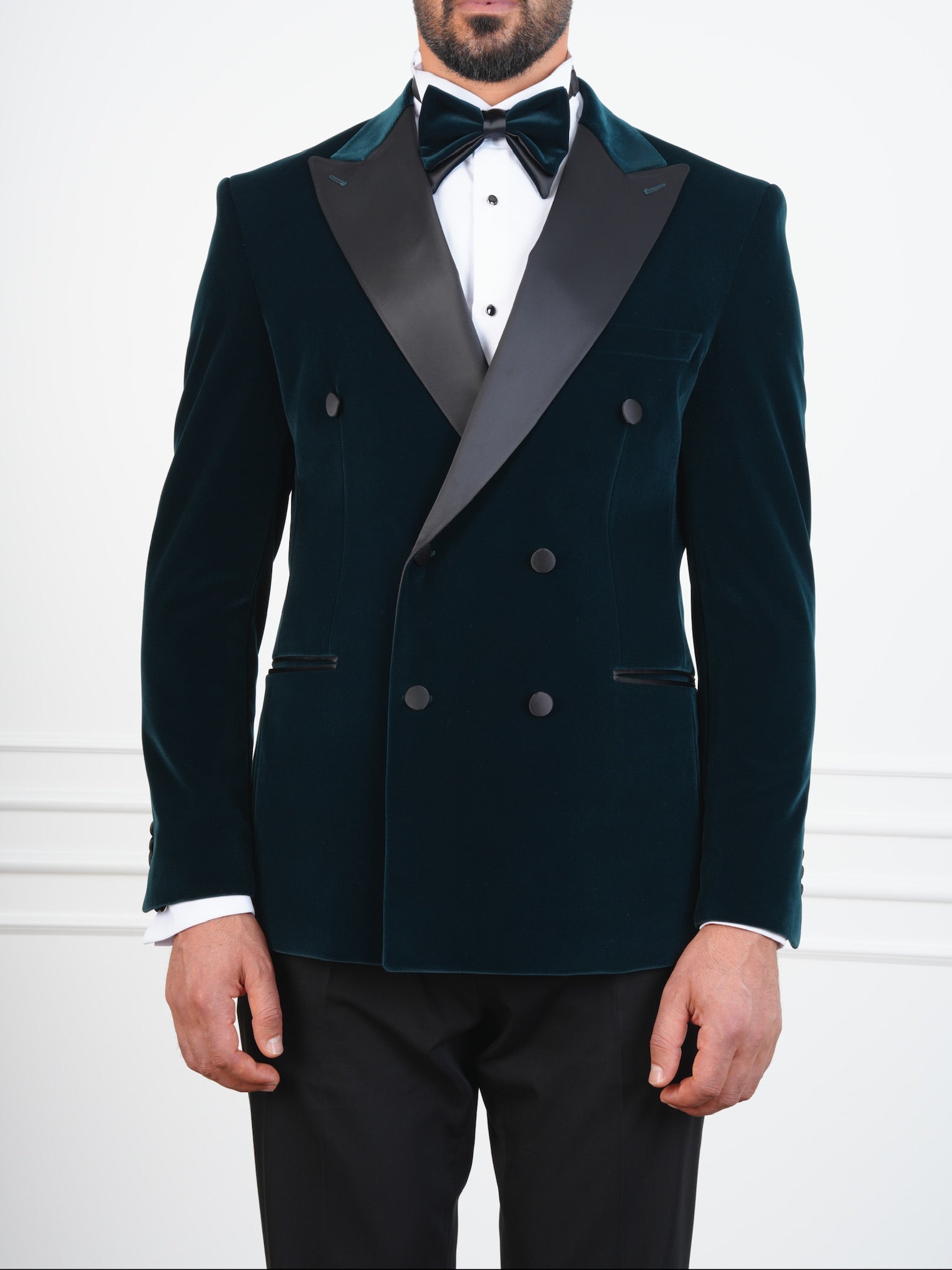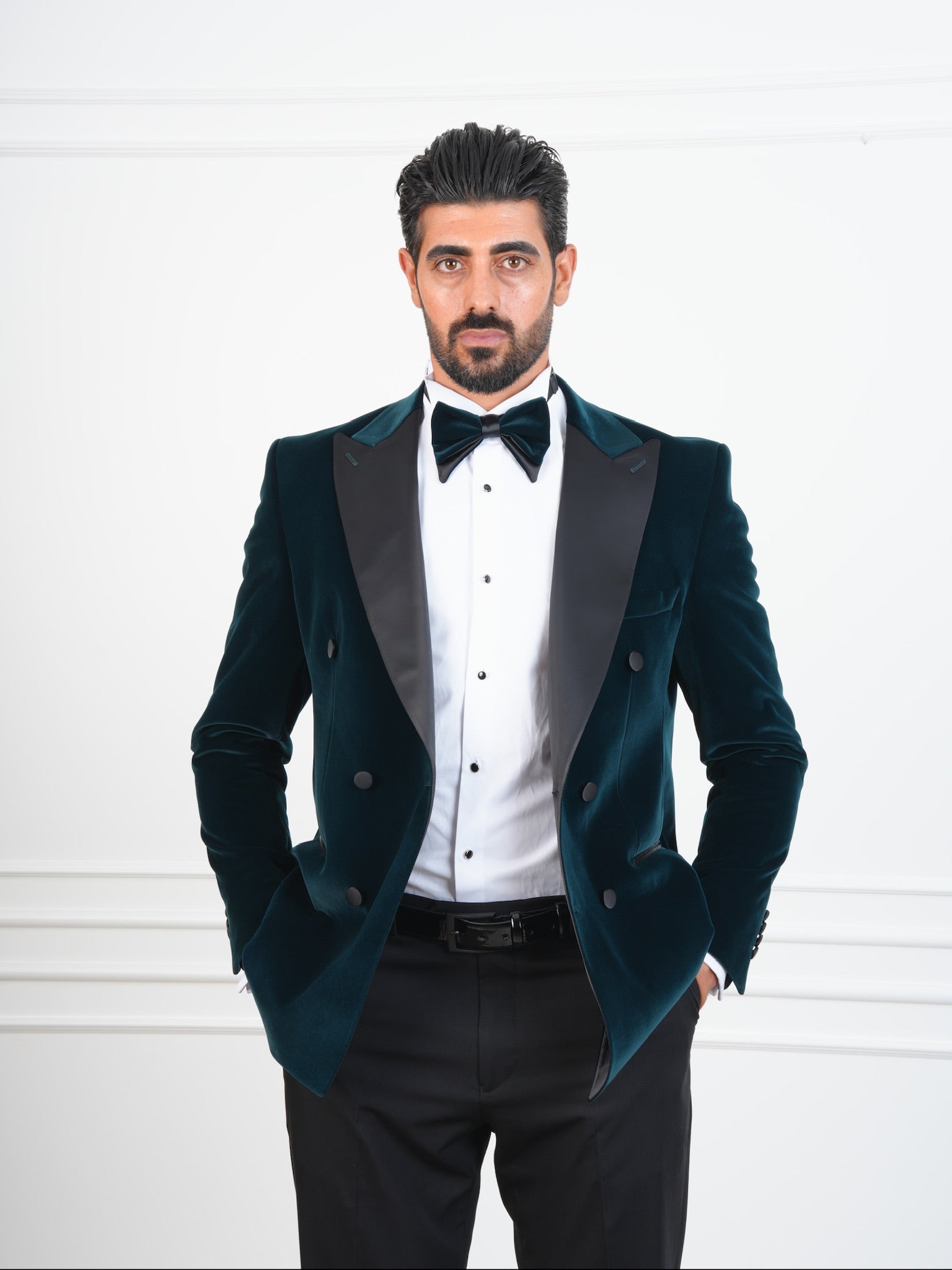The Viridian – Ocean Green Velvet Double-Breasted Tuxedo with Satin Lapel and Bow Tie